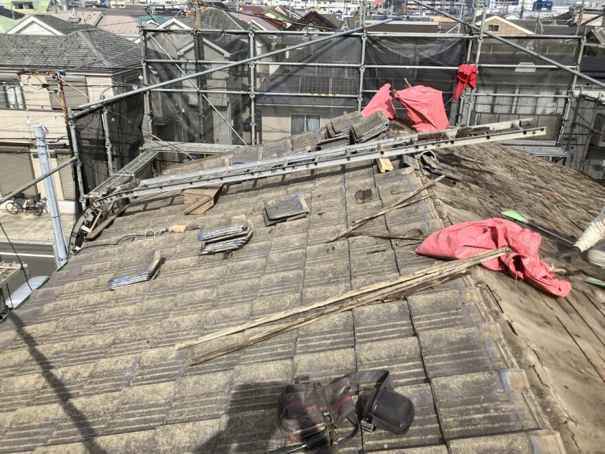 古くなったセメント瓦を解体し、屋根上を下地板のみの状態にします