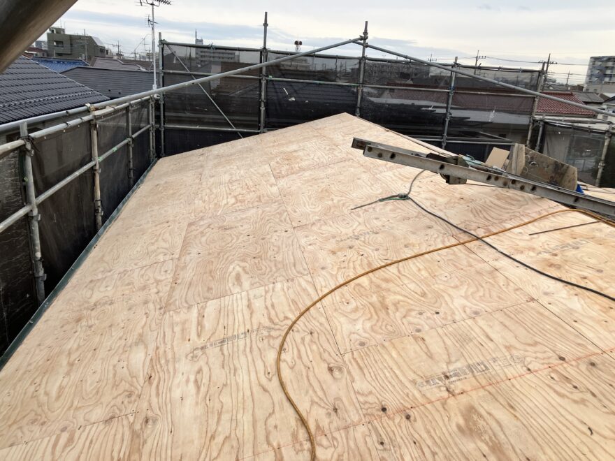 屋根葺き替え工事では耐久性のある構造用合板を使用します