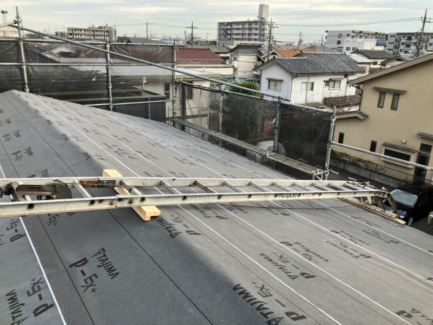 既存のものより耐久性の高い「改質アスファルトルーフィング」を構造用合板の上に貼ります