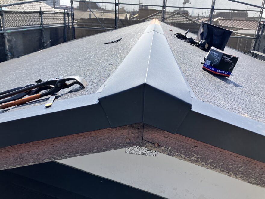 防腐処理した貫板・錆に強いガルバニウム製の棟板金を取付し端部を折り曲げ加工しています